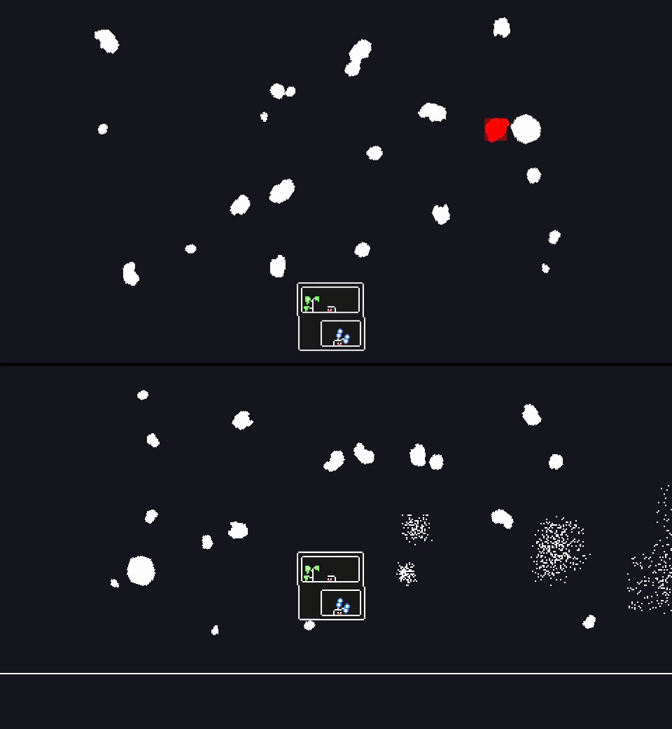 To illustrate the work being done, the gif above pauses on every update and highlights the roids we are checking against. The object we collide against is a house with two gnorps inside. The collision detection function simply goes through the list of roids to find if there is any intersection.